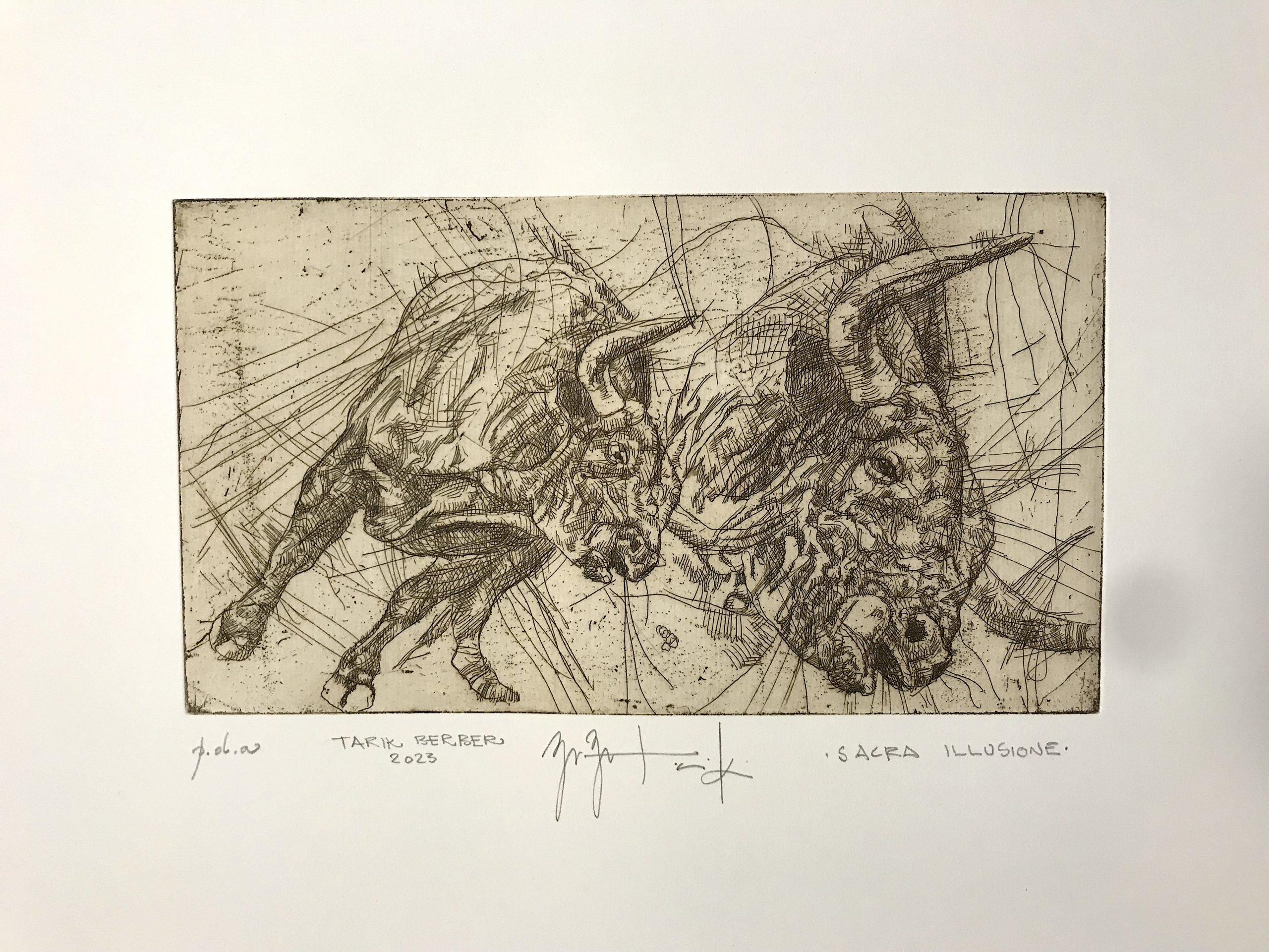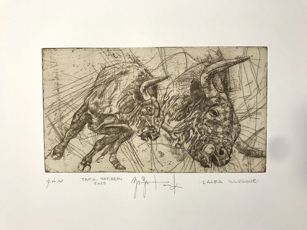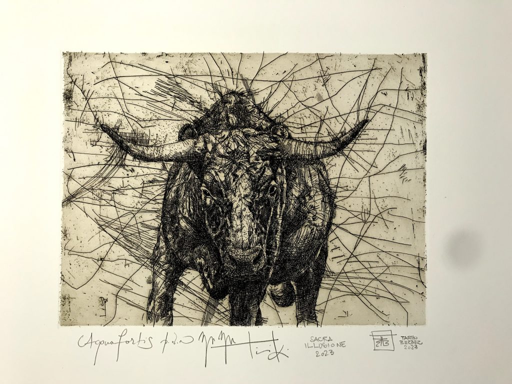 Con Sacra Illusione, uno straordinario lavoro che gira intorno all’arte tauromachia e all’arte in generale, un altro artista italiano si è confrontato recentemente con la prova dell’arte taurina. Un caso molto singolare, quello di Tarik Berber, quarantacinquenne fiorentino di origine bosniaca che da molti anni si è distinto per l’eclettismo della sua ricerca, focalizzata tra disegno pittura e incisione. Vive a Milano dove lavora con la Galleria SaIamon. Il grande pubblico lo conosce per le sue animazioni disegnate a mano, come quella per Marracash “DUBBI”(Universal) o l’ultima per Aleksandar Hemon “LINT” (Princeton University, US). Numerose le personali in musei nazionali e internazionali.