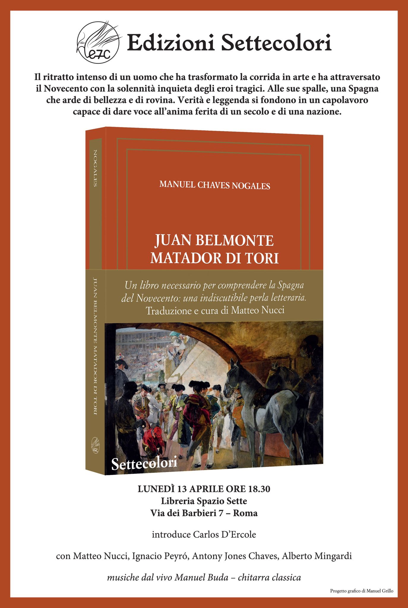 Il prossimo 13 aprile, a Roma, alle 18:30, nei locali della Libreria Spazio Sette, via dei Barbieri 7, la casa editrice Settecolori ha organizzato una serata speciale. A parlare del capolavoro di Manuel Chaves Nogales, ci sarà innanzitutto il nipote, Antony Jones Chaves, assieme allo scrittore Ignacio Peyró, direttore dell’Istituto Cervantes a Roma, e gli aficionados italiani Carlos D’Ercole, anima spagnola di Settecolori, Alberto Mingardi, giornalista e politologo, e Matteo Nucci, scrittore.
